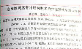 北京东方博大医院,男科数据抽样分析:在338例患者年龄20岁-47岁,平均32岁。病程2-25年,平均7年早泄患者中。合并包皮过长者172例,包皮环切术后101例。射精潜伏期0-90s,平均48s。性伴侣满意度5%-40%,平均20%。每周性交次数2-5次,平均3.2次。所有患者均为已婚或固定性伴侣,性生活规律且在一年以上。外生殖器发育正常。性激素各指标正常,尿常规及前列腺液常规指标正常。B超睾丸附睾前列腺均正常。手术效果显示:338例患者中:显效216例,好转86例,有效率为89.3%。无效36例。性伴侣满意度平均83%。所有患者术后无阴茎勃起功能障碍,性生活时性快感无影响。